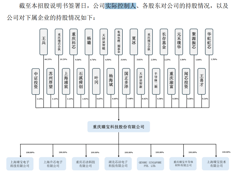 另外,王兵配偶夏冰、王兵哥哥王喜才、王兵姐姐王凤英以及重庆臻芯合伙、重庆臻宝合伙均为王兵一致行动人,其中夏冰、王喜才直接持股比例分别为3.01%、0.24%,即王兵实际表决权超六成。