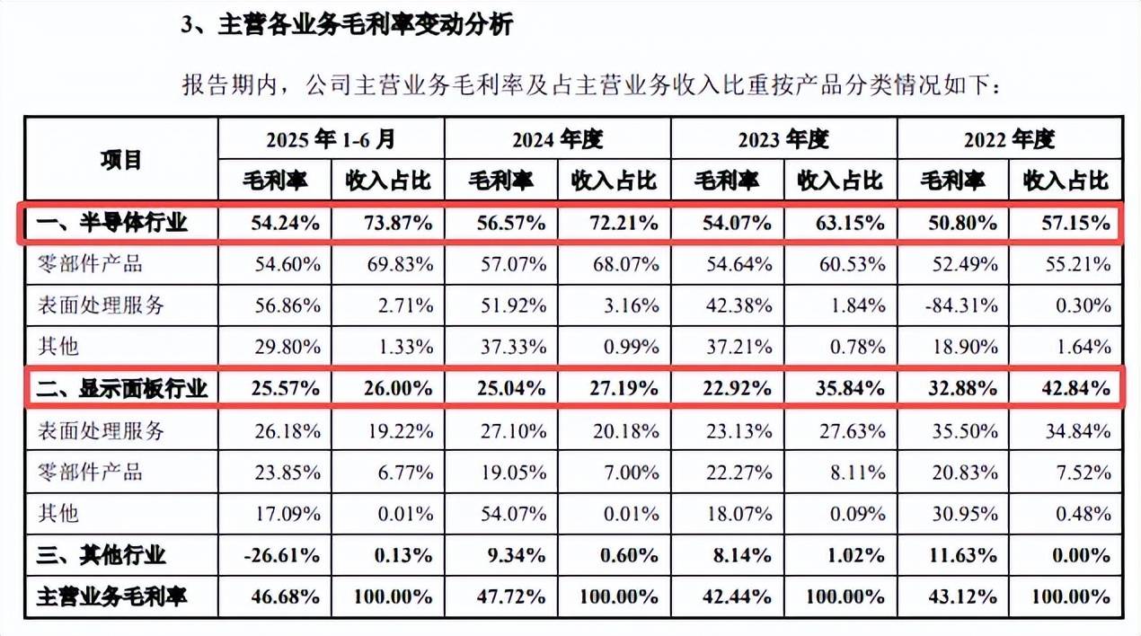 主营业务毛利率呈现波动态势,分别为43.12%、42.44%、47.72%、46.68%,期末较上年末下滑1.04个百分点,这主要与半导体行业有关,毛利率分别为50.8%、54.07%、56.57%、54.24%,期末较上年末下滑2.33个百分点,显示面板行业毛利率分别为32.88%、22.92%、25.04%、25.57%。