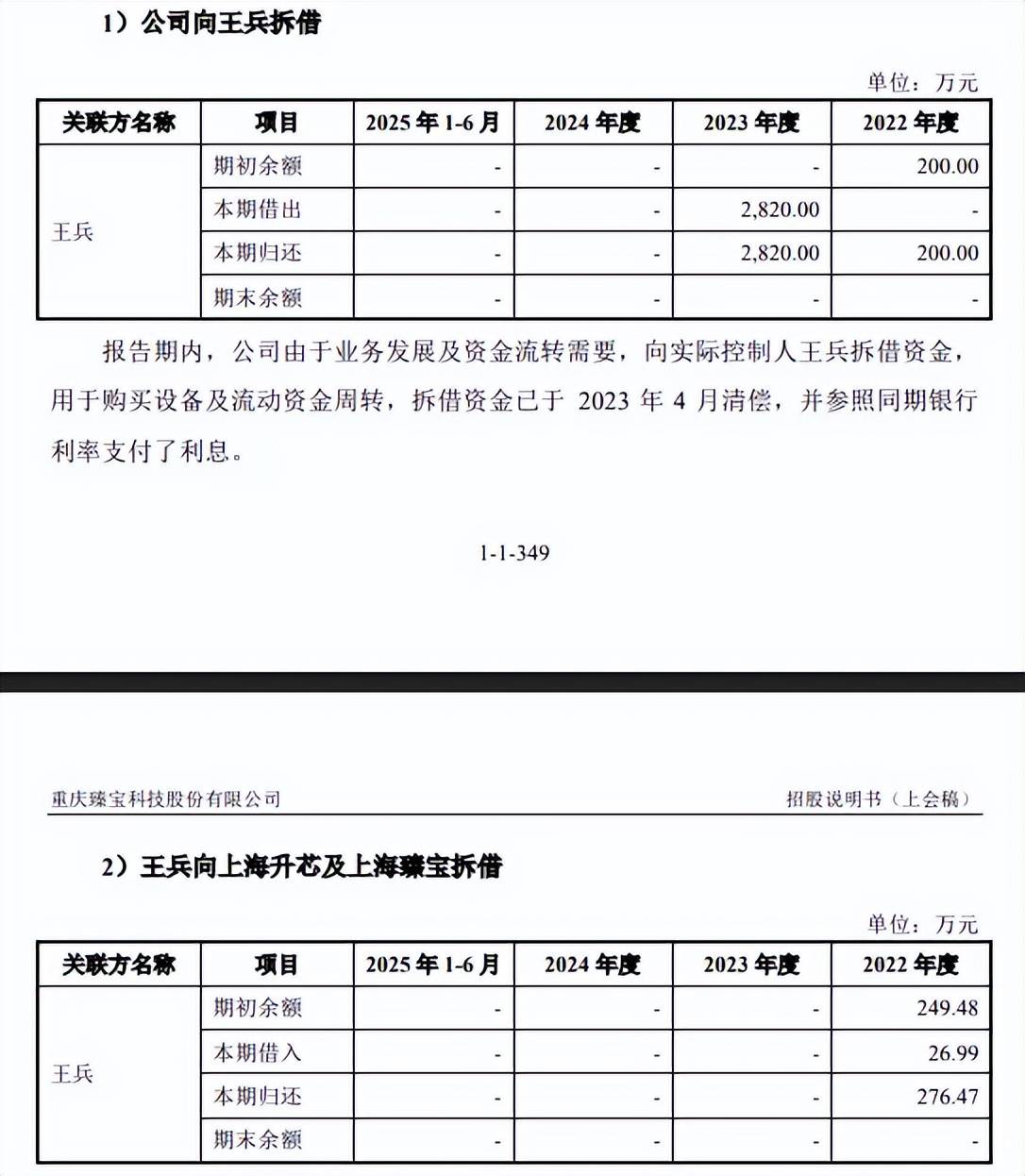 2022年初,王兵对臻宝科技、子公司上海升芯拆出余额为249.48万元,期内继续拆出26.99万元,当期全部归还,公司称出于周转资金需要。
