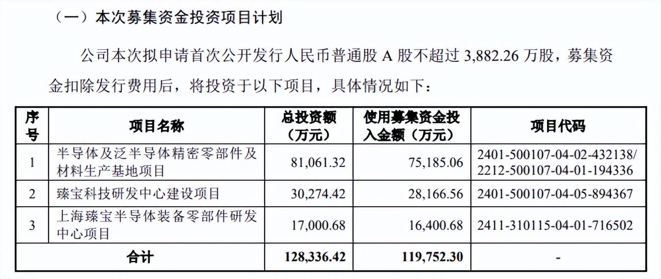 据短平快解读了解,本次IPO,臻宝科技拟公开发行不超过3,882.26万股,拟募集资金11.98亿元,用于半导体及泛半导体精密零部件及材料生产基地项目、臻宝科技研发中心建设项目、上海臻宝半导体装备零部件研发中心项目,拟使用募集资金分别为7.52亿元、2.82亿元、1.64亿元。