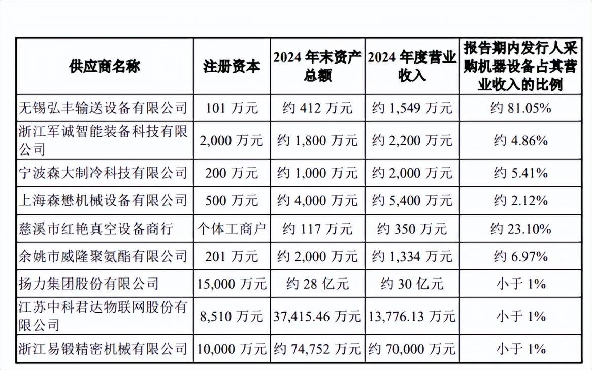 值得关注的是,无锡弘丰八成以上收入来源于公司,2024年收入约为1549万元,公司采购机器设备占其营业收入的比例高达81.05%,这种情况是否正常?深交所在问询中要求公司说明向无锡弘丰输送设备有限公司采购生产线比例较高的原因及合理性,相关采购价格的公允性。