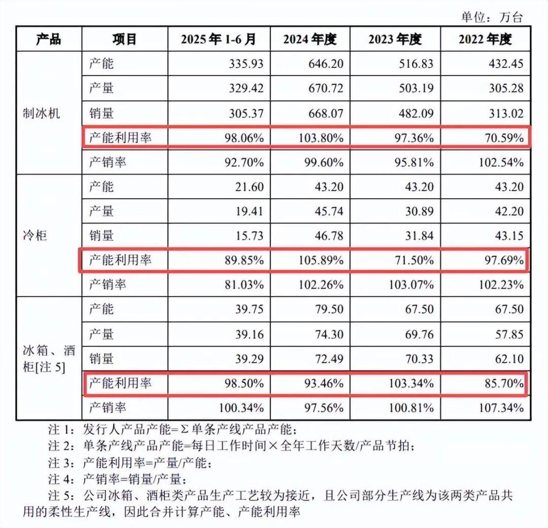 报告期内,公司制冰机产能利用率分别为70.59%、97.36%、103.8%、98.06%,2024年产能为646.2万台;冷柜产能利用率分别为97.69%、71.5%、105.89%、89.85%,2024年产能为43.2万台;冰箱、酒柜产能利用率分别为85.7%、103.34%、93.46%、98.5%,2024年产能为79.5万台,合计产能为768.9万台,而本次扩建、技改合计产能为816万台,已经超过2024年全年产能了,显然扩产步伐较大。