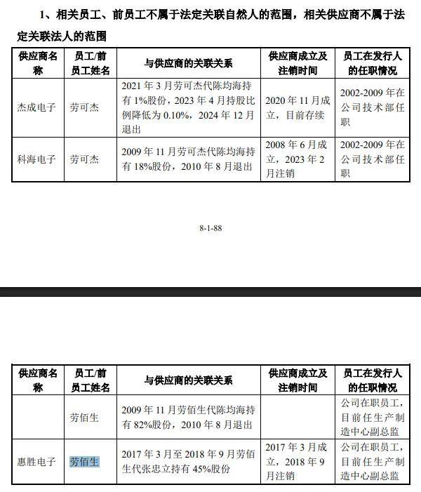 据披露,瑞益电子相关主体慈溪市惠胜电子有限公司(惠胜电子)成立于2017年3月,成立当年与公司存在交易,公司时任生产车间副主任劳佰生(目前为生产制造中心副总监)代张忠立持有惠胜电子股份,持股比例高达45%,2018年9月该公司注销,张忠立为瑞益电子实际控制人,持股比例高达80%。