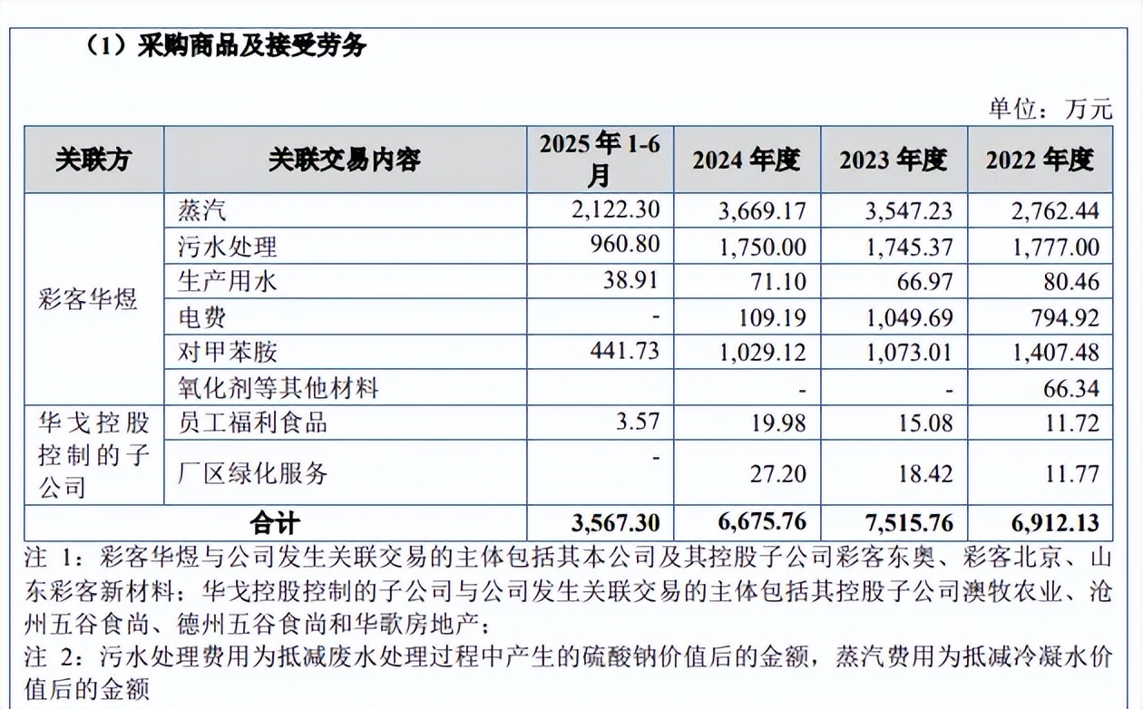 其中向关联方彩客华煜采购蒸汽和污水处理服务的金额较大,报告期内采购蒸汽的金额分别为2,762.44万元、3,547.23万元、3,669.17万元和2,122.30万元;采购污水处理服务的金额分别为1,777.00万元、1,745.37万元、1,750.00万元和960.80万元。