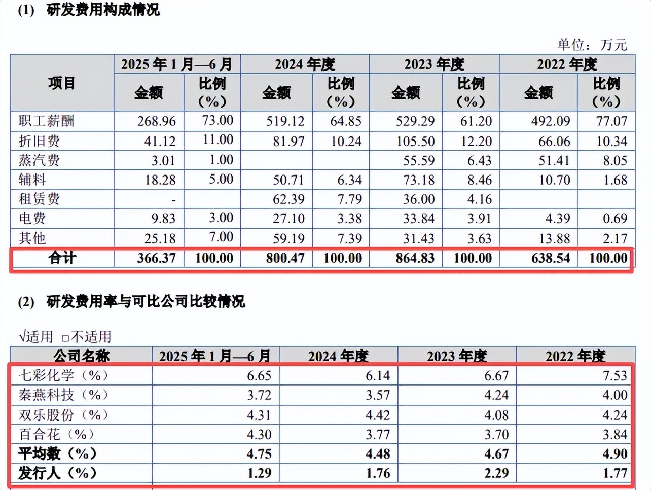 对比行业,可比同行研发费用率均值分别为4.9%、4.67%、4.48%、4.75%,进一步来看,报告期内可比同行研发费用率均远超公司,以2024年为例,七彩化学、秦燕科技、双乐股份、百合花分别为6.14%、3.57%、4.42%、3.77%。