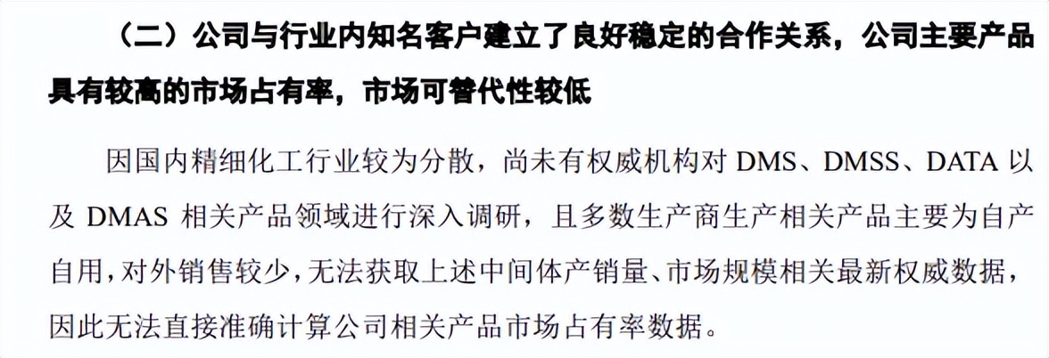 彩客科技称主要产品具有较高的市场占有率,市场可替代性较低,但随后又给出国内精细化工行业较为分散,无法获取上述中间体产销量、市场规模相关最新权威数据,所以无法直接准确计算公司相关产品市场占有率数据,这种表述是否自相矛盾呢?