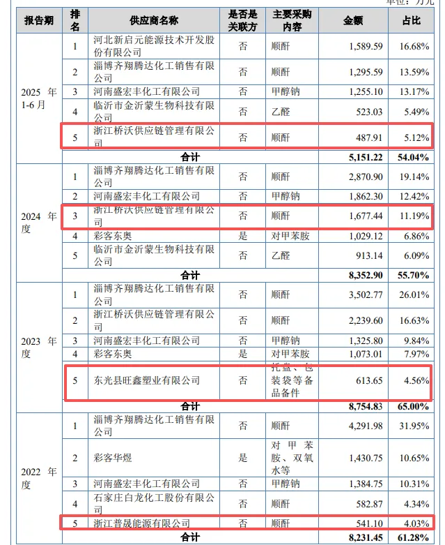 2023年、2024年、2025年1-6月,浙江桥沃供应链管理有限公司(浙江桥沃)均为公司前五供应商,采购额分别为2,239.60万元、1,677.44万元、487.91万元,占比分别为16.63%、11.19%、5.12%。