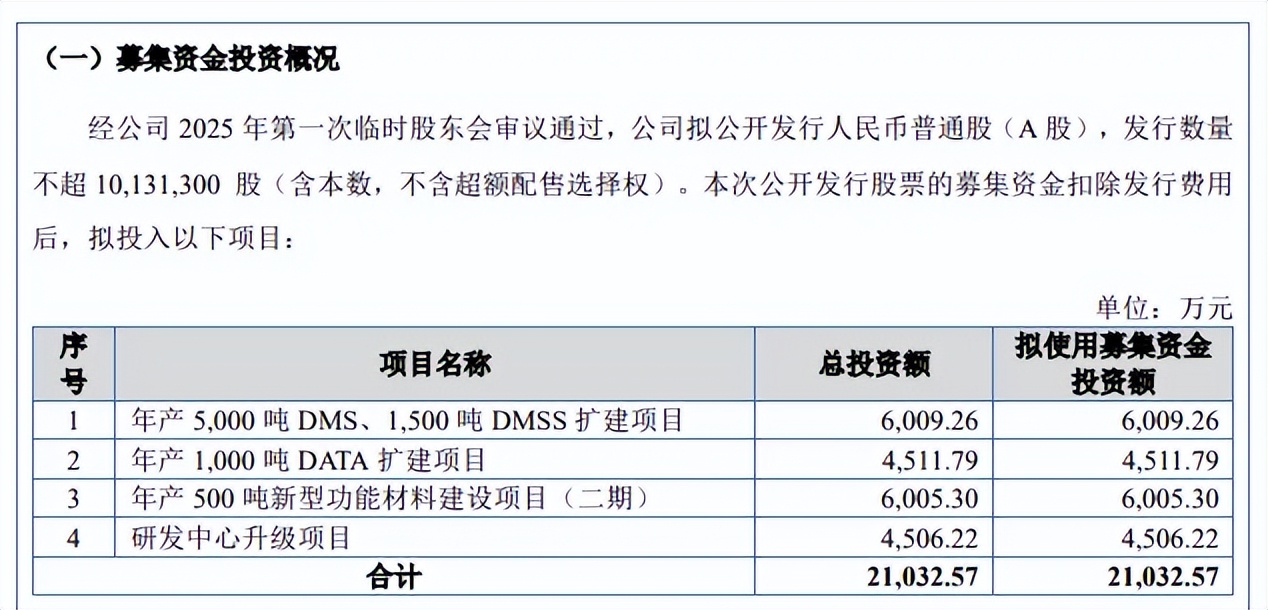 据短平快解读了解,本次IPO,彩客科技拟公开发行不超过1013.13万股,拟募集资金21,032.57万元,用于年产5,000吨DMS、1,500吨DMSS扩建项目、年产1,000吨DATA扩建项目、年产500吨新型功能材料建设项目(二期)以及研发中心升级项目,拟使用募集资金分别为6,009.26万元、4,511.79万元、6,005.30万元、4,506.22万元。