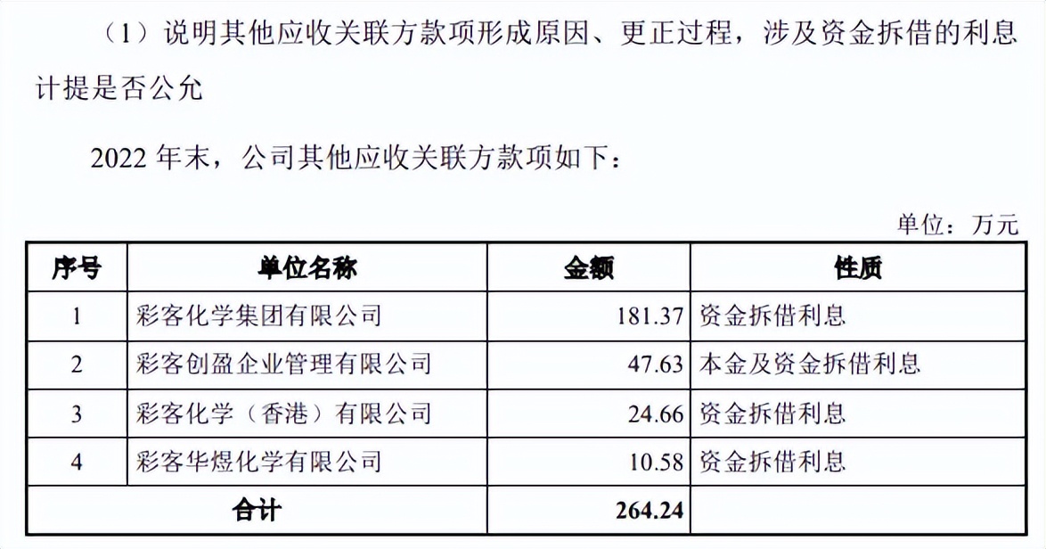 曾与多家关联方存在资金拆借。2022年末,彩客科技对其他应收关联方款项合计264.24万元,其中对彩客化学集团有限公司、彩客创盈企业管理有限公司、彩客化学(香港)有限公司、彩客华煜化学有限公司的款项分别为181.37万元、47.63万元、24.66万元、10.58万元,均涉及资金拆借利息,2023年末相关关联方偿还上述款项。