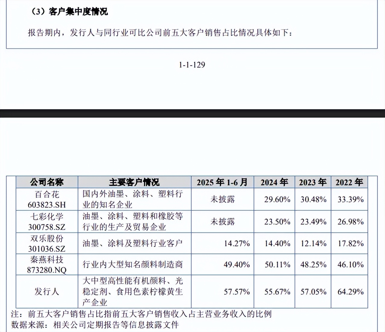 超5成收入来源于前五客户,客户集中度超同行。报告期内,彩客科技来自前五客户的销售额分别为2.32亿元、2.15亿元、2.53亿元、1.63亿元,占比分别为64.29%、57.05%、55.67%、57.57%,客户包括温州金源、印度Sudarshan、印度Roha、DIC集团、山东凯瑞澳盛国际贸易有限公司。