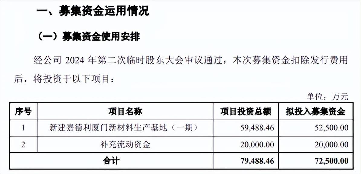 据短平快解读了解,本次IPO,嘉德利拟公开发行不超过10,329.1885万股(未考虑超额配售选择权的情况下),拟募集资金7.25亿元,用于新建嘉德利厦门新材料生产基地(一期)、补充流动资金,拟使用募集资金分别为5.25亿元、2亿元。