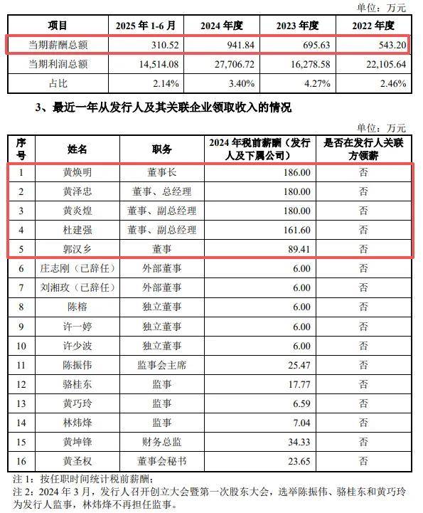 2024年,董事长黄焕明、董事、总经理黄泽忠、董事、副总经理黄炎煌、董事、副总经理杜建强薪酬分别为186万元、180万元、180万元、161.6万元,董事郭汉乡薪酬为89.41万元,5人薪酬合计797.01万元,占当期董监高薪酬比例高达约85%。