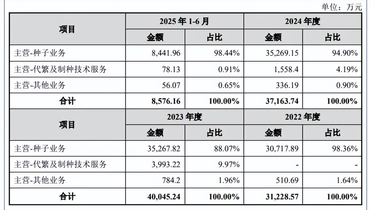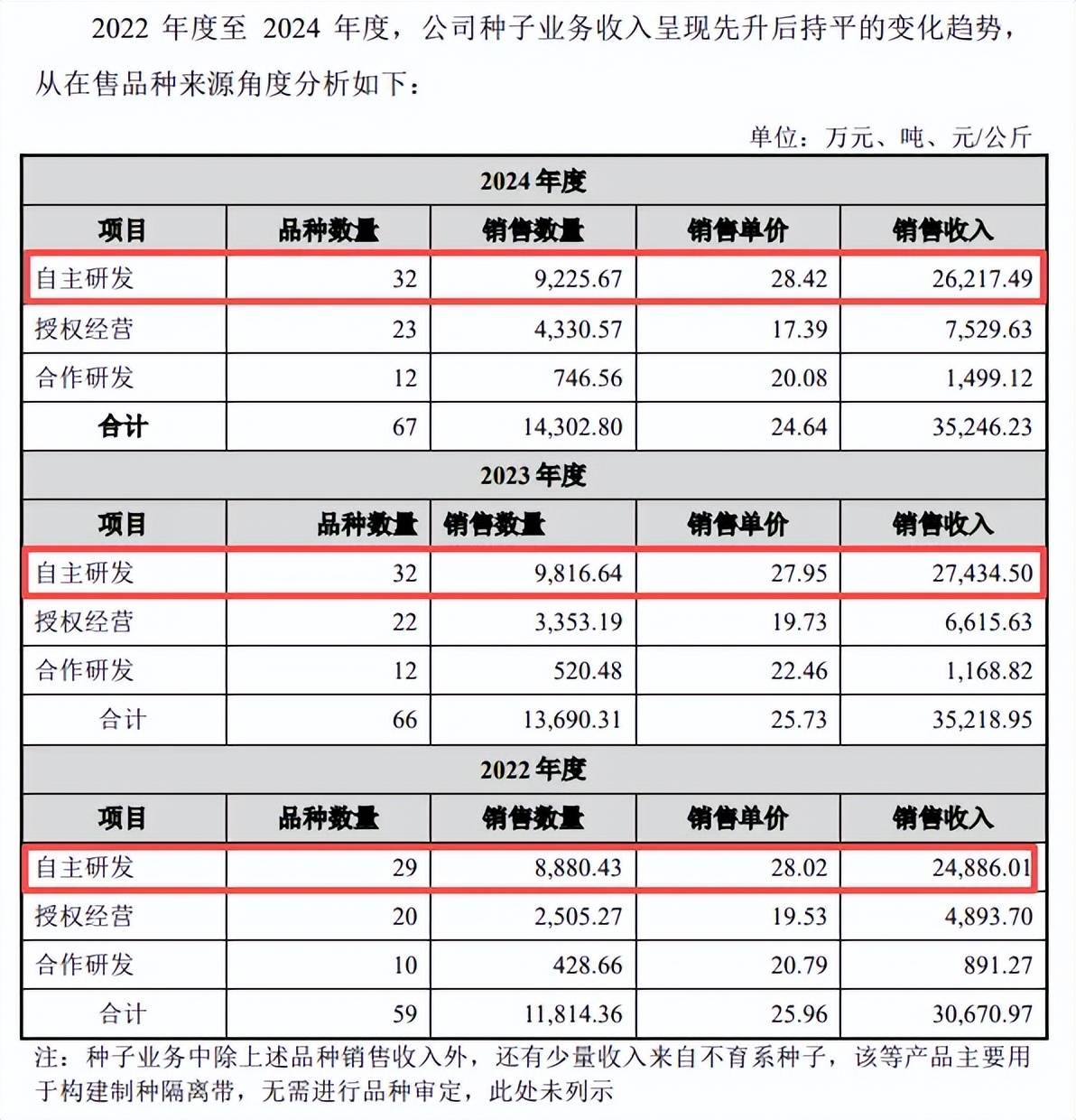 进一步来看,种子业务收入波动与自主研发的品种有关,2022年至2024年销售量分别为8,880.43吨、9,816.64吨、9,225.67吨,销售收入分别为24,886.01万元、27,434.50万元、26,217.49万元,2024年同比下滑4.44%。