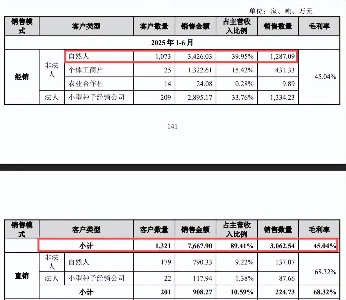 由于种子的终端用户为种植农户,农户数量较多,区域分布较广且零散,因此公司经销商集中度较低,数量较多,报告期内分别为1,455家、1,580家、1,617家、1321家,其中又以自然人为主,分别为1205家、1322家、1337家、1073家。