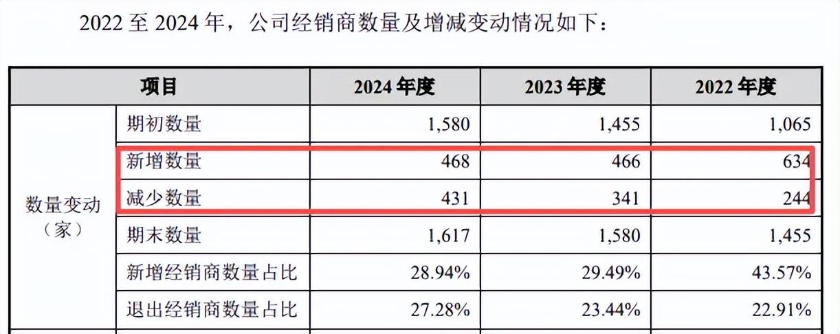 需要指出的是,经销商数量变动较大,2022年至2024年减少数量分别为244家、341家、431家,退出经销商数量占比分别为22.91%、23.44%、27.28%,新增经销商数量分别为634家、466家、468家,新增经销商数量占比分别为43.57%、29.49%、28.94%,整体来看,经销商新增和退出数量主要集中于销售金额在50万元以下的合作规模相对较小的经销商层级。