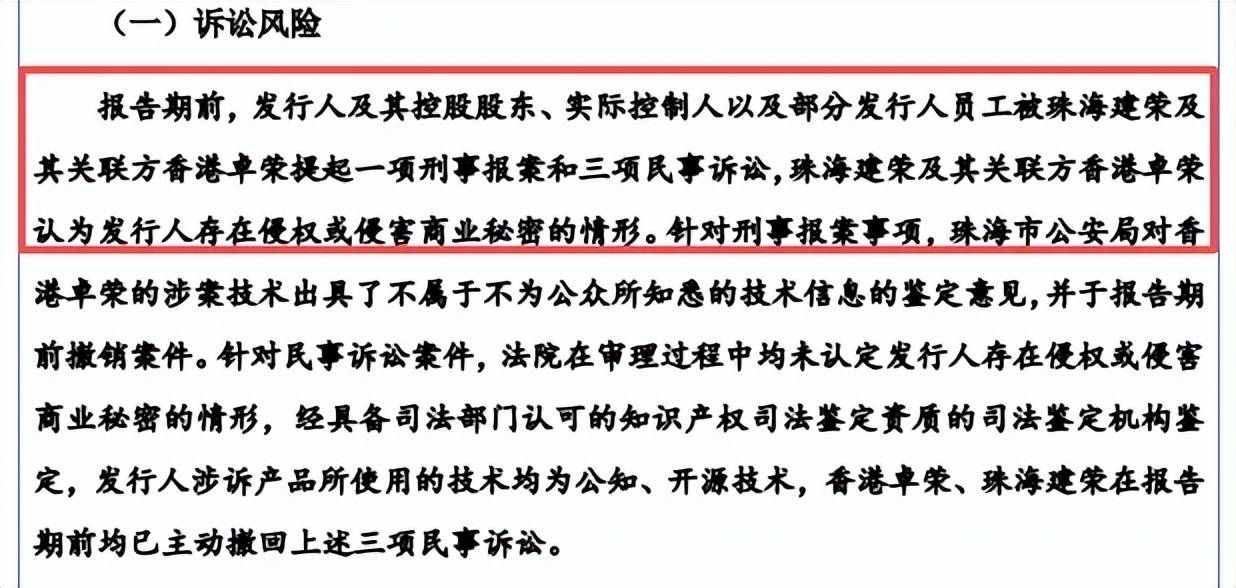 据披露,对于刑事报案,珠海市公安局对香港卓荣的涉案技术出具了不属于不为公众所知悉的技术信息的鉴定意见,并于报告期前撤销案件。对于民事诉讼,法院在审理过程中均未认定发行人存在侵权或侵害商业秘密的情形,经具备司法部门认可的知识产权司法鉴定资质的司法鉴定机构鉴定,发行人涉诉产品所使用的技术均为公知、开源技术,香港卓荣、珠海建荣在报告期前均已主动撤回上述三项民事诉讼。