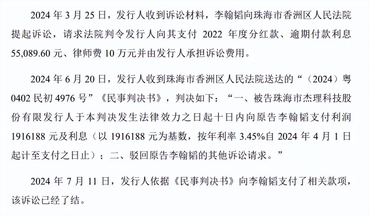 2024年3月,公司收到诉讼材料,李翰韬请求珠海市香洲区人民法院判令公司向其支付2022年度分红款、逾期付款利息55,089.60元、律师费10万元并由公司承担诉讼费用。6月,法院判决公司向原告李翰韬支付利润1916188元及利息(以1916188元为基数,按年利率3.45%自2024年4月1日起计至支付之日止),公司在7月11日支付相关款项,诉讼已经了结。