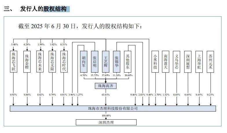 实控人表决权超80%。杰理科技控股股东是珠海市高齐企业管理咨询有限公司(珠海高齐),直接持股比例为63.01%,实际控制人是王艺辉、张启明、张锦华、胡向军,直接持股比例分别为9.48%、3.96%、2.83%、1.27%,合计持股17.54%的股份,同时四人分别持有珠海高齐37.69%、15.75%、11.26%、4.70%股权,即四人直接、间接合计控制公司80.55%的表决权。