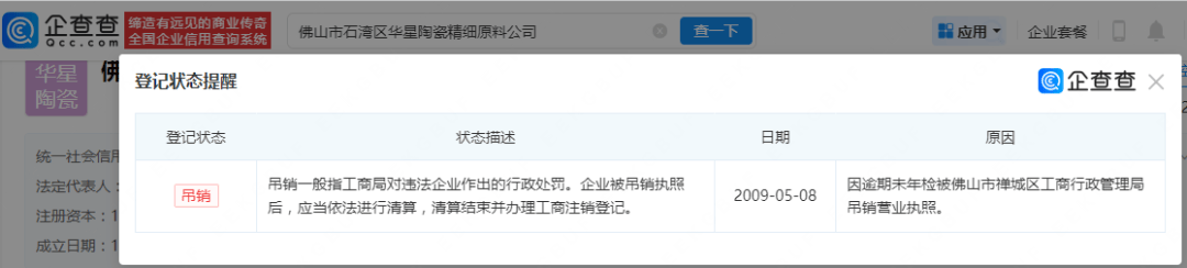 企查查显示,黄超亮曾是华星陶瓷、华星实业、华星精细材料的法人代表,三家公司分别在2009年5月、2010年3月、2022年7月被吊销,前两家企业均因逾期未年检被佛山市禅城区工商行政管理局吊销营业执照。