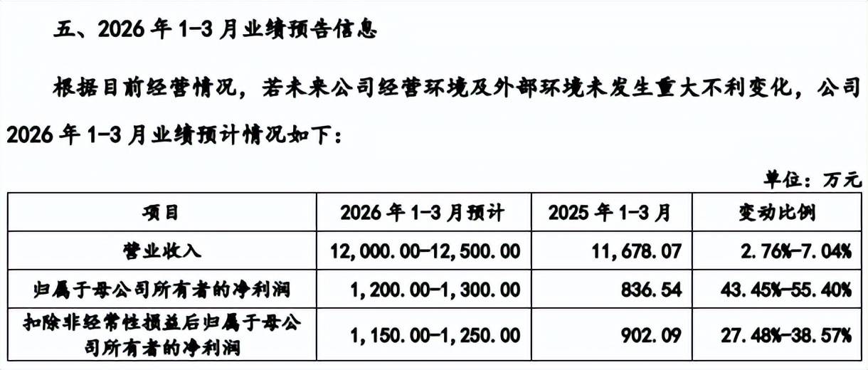 公司预估2026年Q1实现营业收入1.2亿元至1.25亿元,同比增长2.67%至7.04%;归母净利润1200万元至1300万元,同比增长43.45%至55.4%,显然收入增速是有所放缓的。