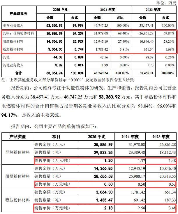 需要指出的是,三大类产品的销售单价均有所下滑,每吨导热粉体材料从1.48万元下滑至1.2万元,阻燃粉体材料从0.53万元下滑至0.5万元,吸波粉体材料从3.48万元下滑至2.13万元,公司称主要系客户所在行业受外部市场环境变化及内部竞争的影响,下游产业链成本压力较大,并传导至公司所处细分领域,公司增加高性价比产品的销售,使得公司产品平均售价有所降低。