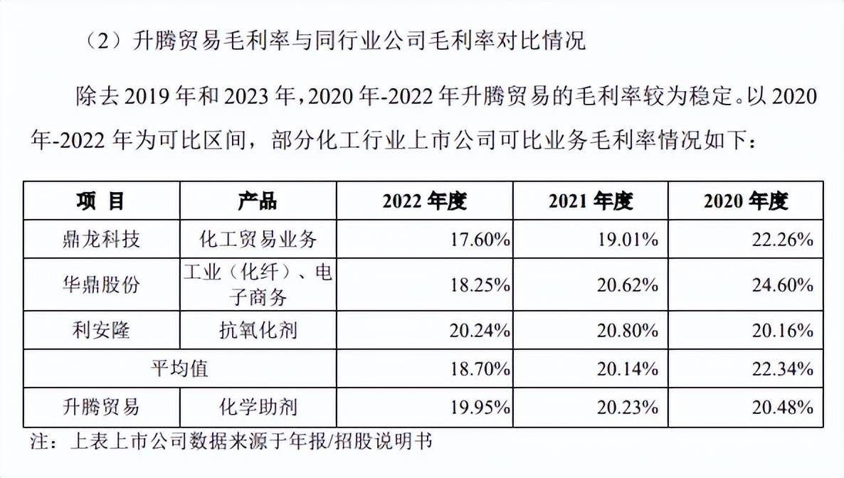 2022年,升腾贸易毛利率均低于利安隆,但是高于鼎龙科技、华鼎股份,上市公司是行业的佼佼者,而升腾贸易参保人数仅个位数,规模更是不可与两家上市公司相比,何以在毛利率上面实现反超?这是否合理?