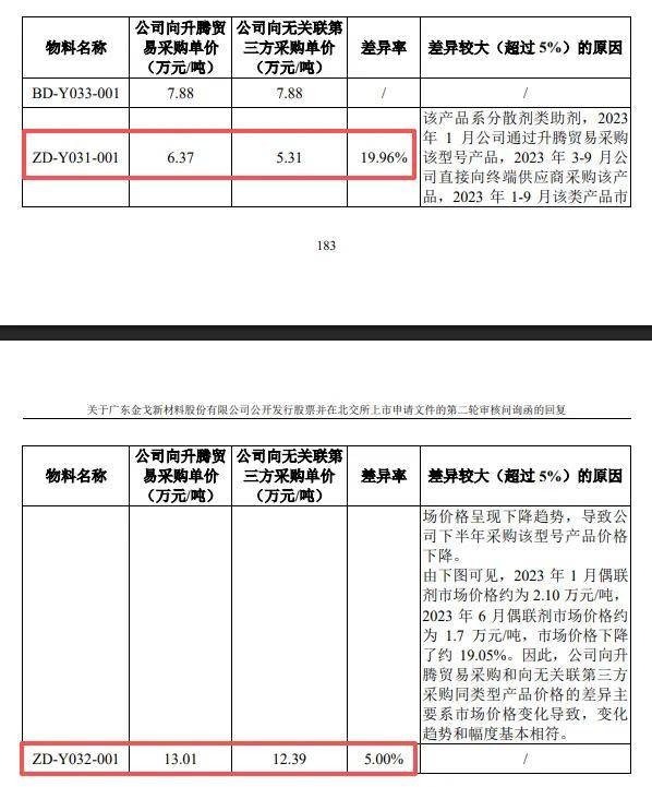 2023年,公司向升腾贸易采购ZD-Y031-001、ZD-Y032-001物料,每吨价格分别为6.37万元、13.01万元,而向无关联第三方采购单价分别为5.31万元、12.39万元,差异率分别为19.96%、5%。公司称,2023年1月公司通过升腾贸易采购该型号产品,2023年3-9月公司直接向终端供应商采购该产品,2023年1-9月该类产品市场价格呈现下降趋势,导致公司下半年采购该型号产品价格下降。
