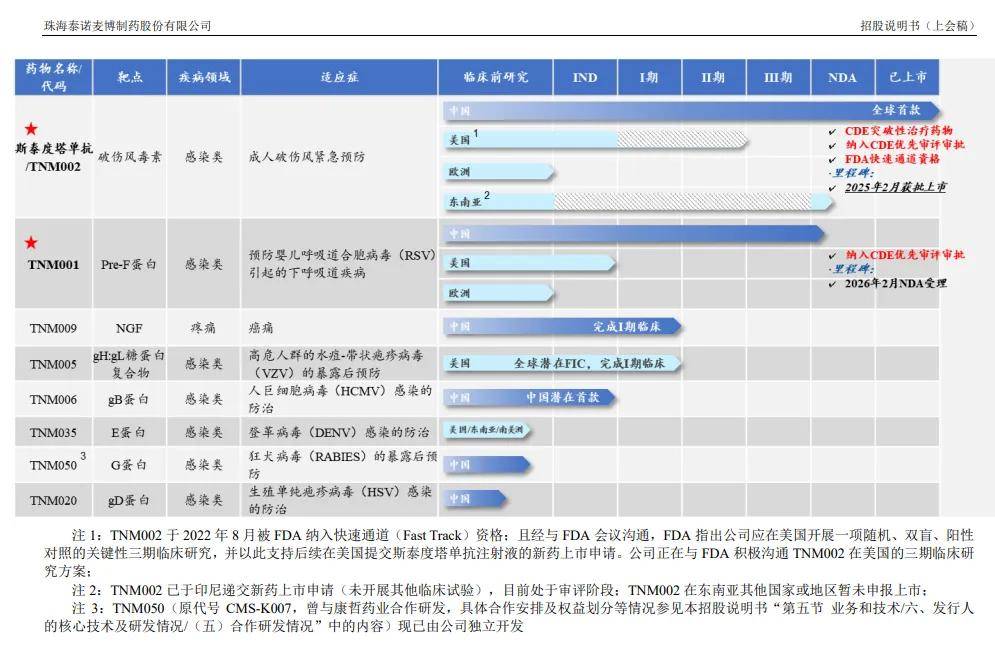 另一款有望实现国内上市的是TNM001,适应症为预防婴儿呼吸道合胞病毒(RSV)引起的下呼吸道疾病,目前该产品已递交NDA并获受理,同时已纳入优先审评程序,但能否上市以及何时上市尚有待时间验证。公司表示,若在审评阶段CDE最终不认可发行人对高危婴儿人群的外推分析、或CDE不认为TNM001-302提供了足够的临床证据,则TNM001-302试验所支持的高危婴儿人群适应症的上市申请或将无法达成。