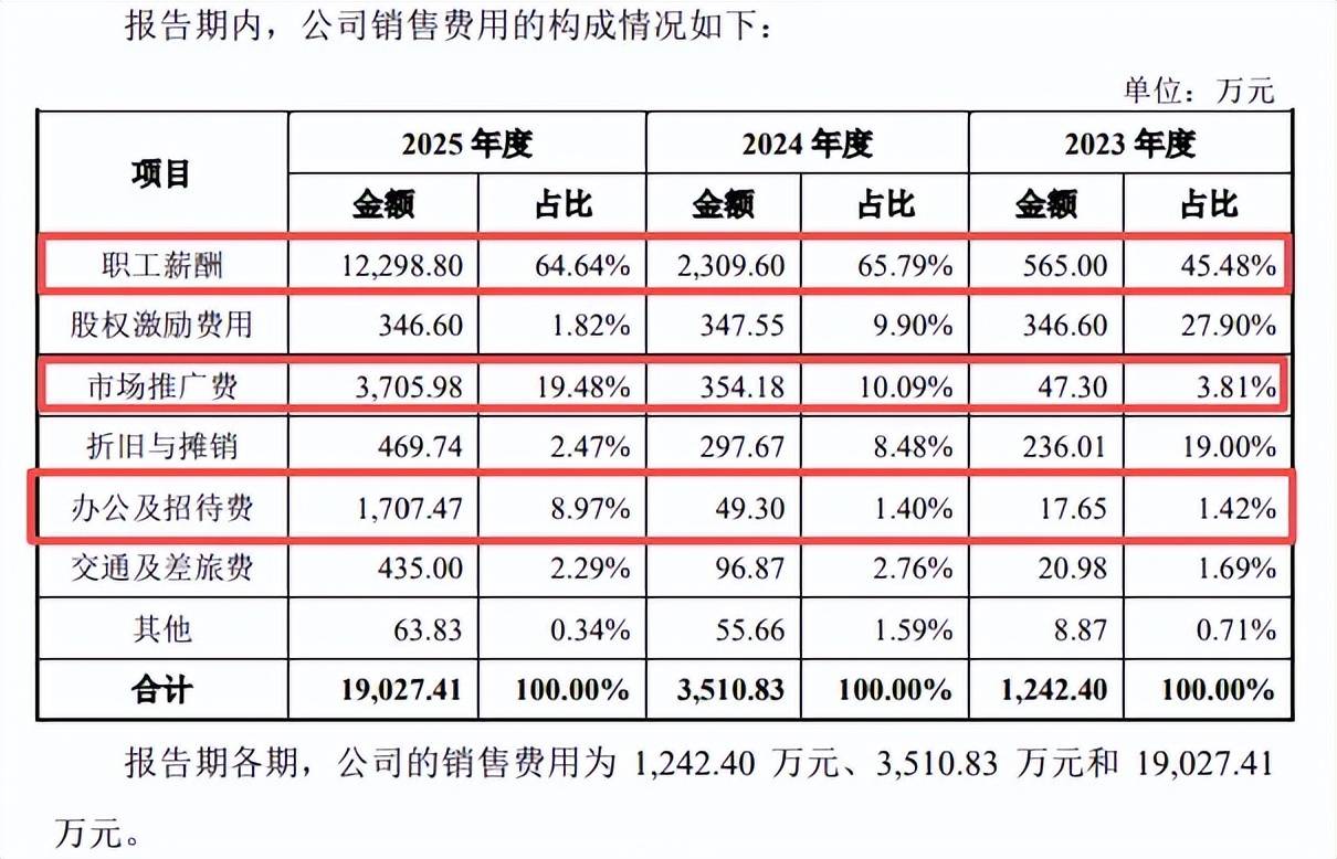 销售人员一年增加210人,销售费用激增1.55亿元。报告期内,麦诺泰博销售费用分别为1,242.40万元、3,510.83万元、19,027.41万元,去年同比大增15516.58万元,增幅4.42倍,销售费用率从2.65%上升至30.24%。