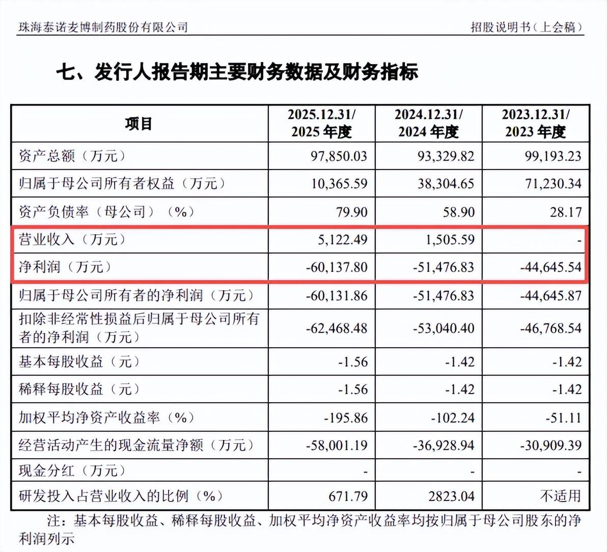 收入增长背后,四年亏损超19亿。2022年、2024年、2025年,麦诺泰博实现营业收入分别为433.98万元、1505.59万元、5122.49万元,因为收入较低,而研发投入较高的原因,公司成立至今仍然处于巨亏中,2022年至2025年净利润分别亏损4.29亿元、4.46亿元、5.15亿元、6.01亿元。