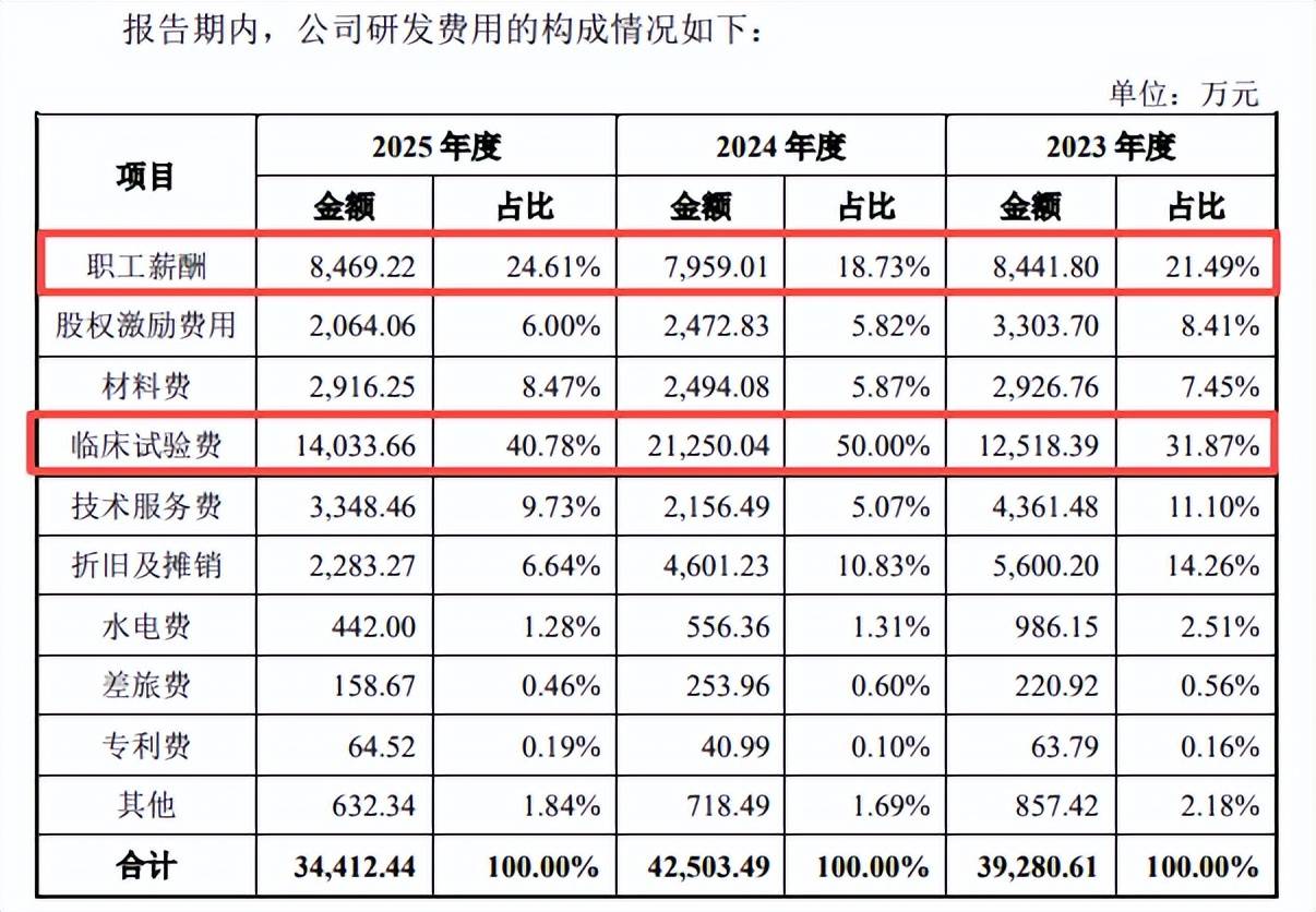 临床试验费是重头,分别为12,518.39万元、21,250.04万元、14,033.66万元,占比分别为31.87%、50%、40.78%;职工薪酬紧随其后,分别为8,441.80万元、7,959.01万元、8,469.22万元,占比分别为21.49%、18.73%、24.61%。