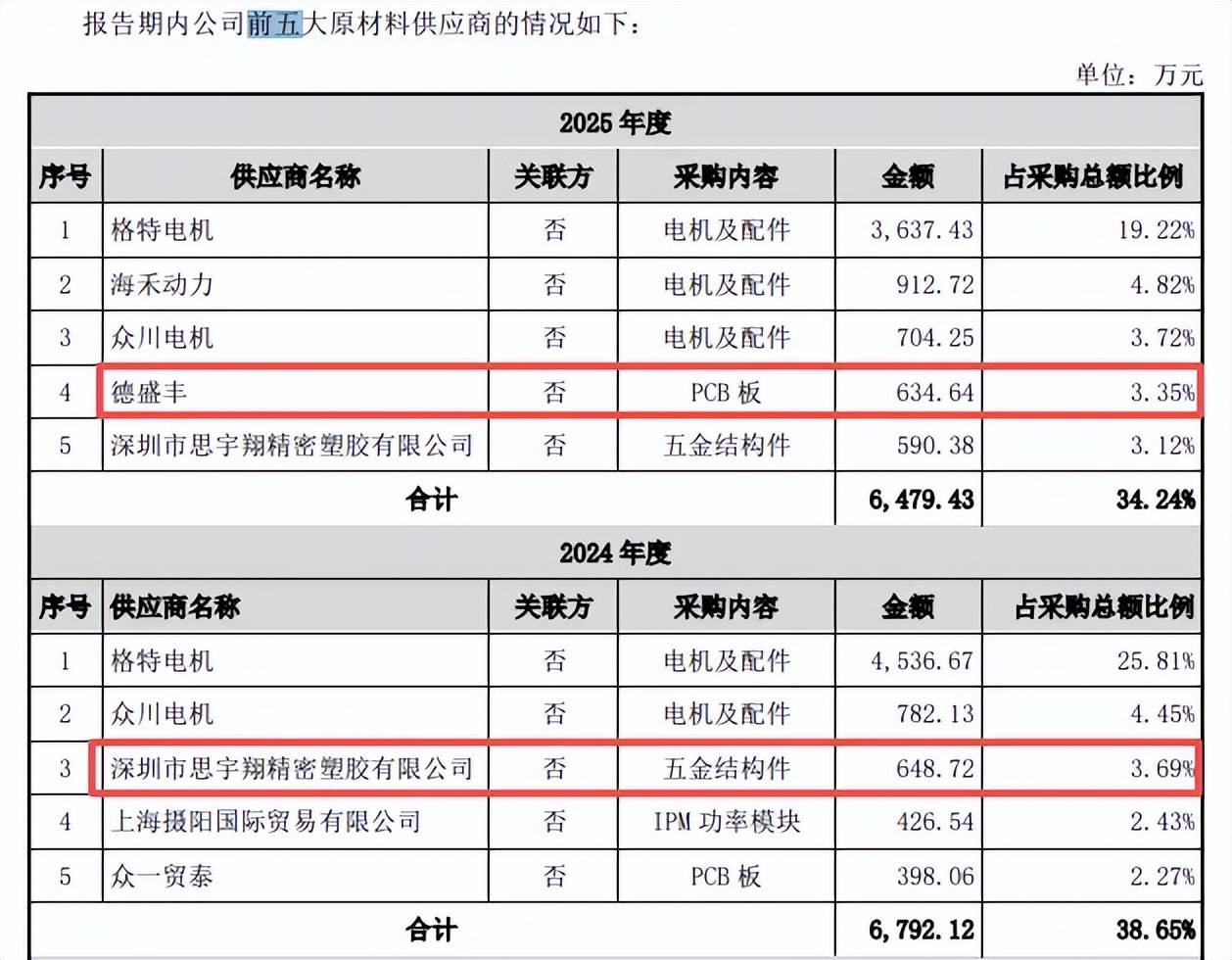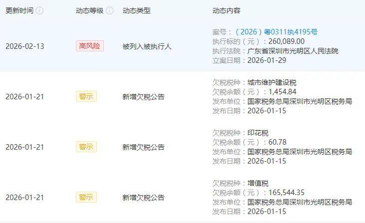 2025年,公司向德盛丰(包括深圳市德盛丰实业有限公司、深圳市德盛丰智能科技有限公司、深圳新阳智控电子有限公司)采购PCB板,采购额为634.64万元,不过深圳市德盛丰智能科技有限公司在2026年1月29日成为被执行人,被执行金额26.01万元,另外该公司在1月份新增欠税公告,增值税、印花税、城市维护建设税,分别为165,544.35元、60.78元、1,454.84元。
