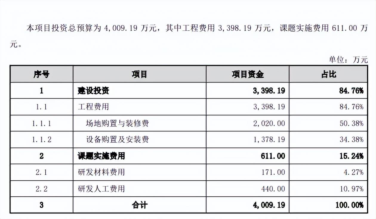研发中心建设项目重头同样是工程费用,金额、占比分别为3,398.19万元、84.76%,其中场地购置与装修费、设备购置及安装费分别为2,020万元、1,378.19万元,占比分别为50.38%、34.38%,课题实施费用近611万元,其中研发人工费用仅440万元。
