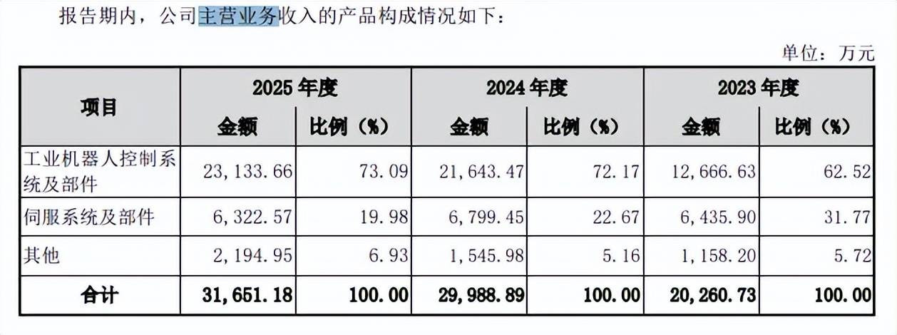 可以看到,2025年营收、净利增速放缓较为明显,公司主营业务收入主要由工业机器人控制系统及部件贡献,分别为1.27亿元、2.16亿元、2.31亿元,占比从62.52%上升至73.09%,伺服系统及部件收入紧随其后,分别为0.64亿元、0.68亿元、0.63亿元,去年同比下滑7.01%,是收入放缓的主要因素之一,收入占比从31.77%下滑至19.98%。