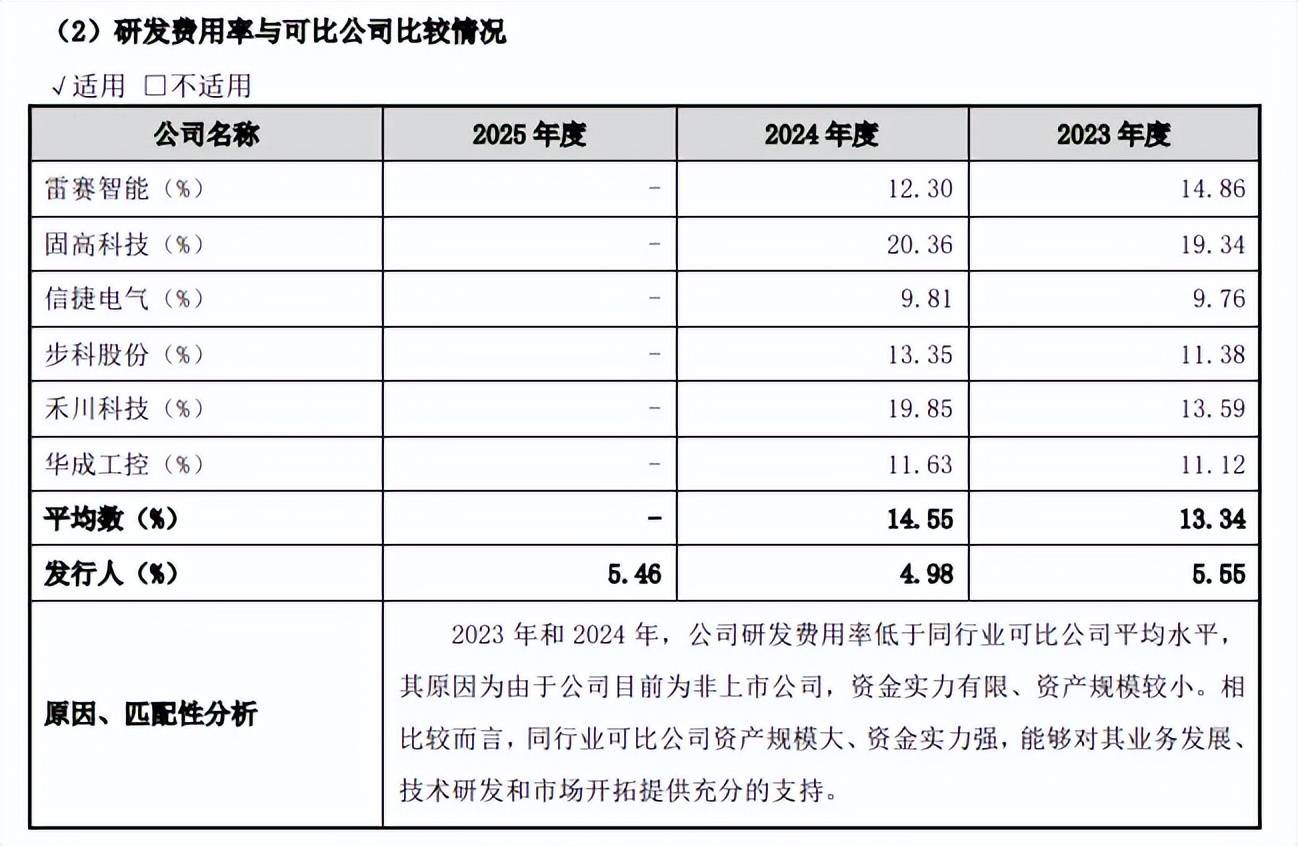 事实上,公司研发费用率在同行中处于垫底,2023年、2024年行业均值分别为13.34%、14.55%,可比同行研发费用率均远超公司,以2024年为例,雷赛智能、固高科技、信捷电气、步科股份、禾川科技、华成工控分别为12.3%、20.36%、9.81%、13.35%、19.85%、11.63%,公司称原因为由于目前为非上市公司,资金实力有限、资产规模较小。