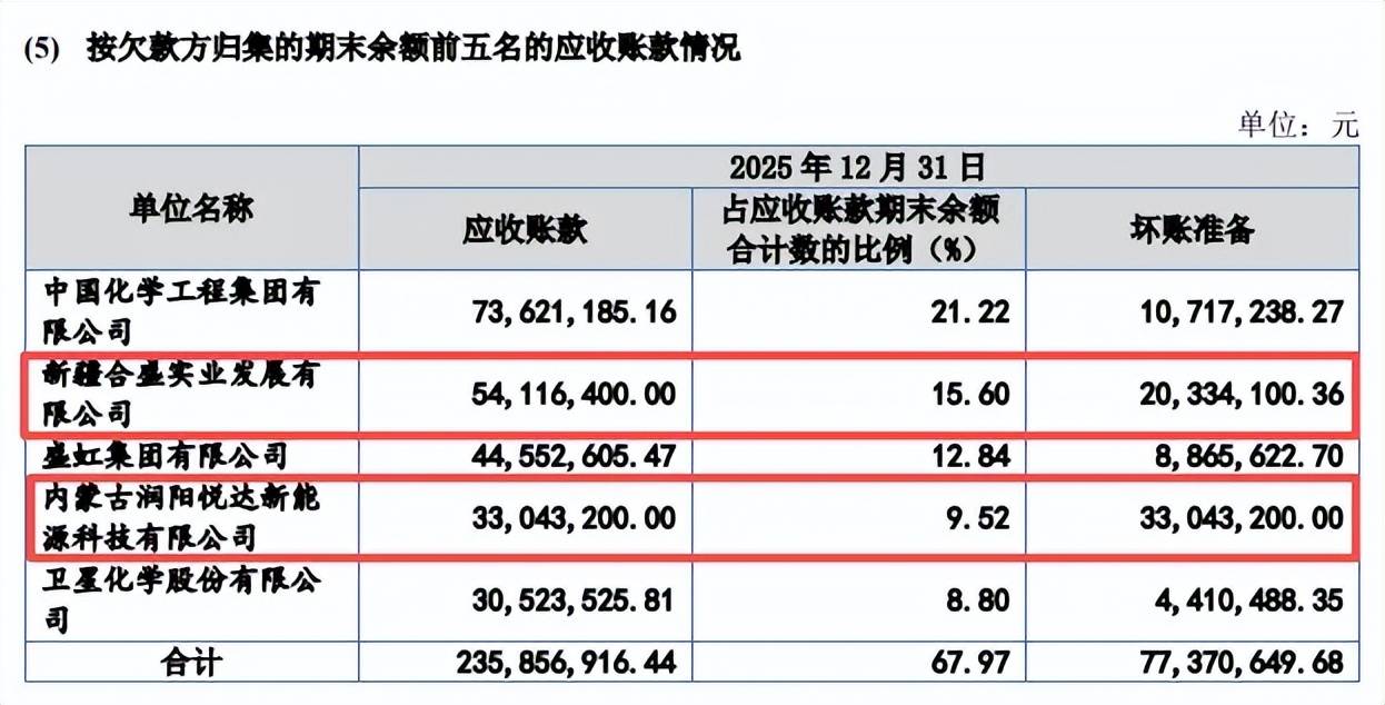 客户集中度高的另一面,应收账款集中度也较高,前五名应收账款欠款余额分别为1.63亿元、2.2亿元、2.36亿元,占比分别为64.45%、63.31%、67.97%,坏账准备分别为0.21亿元、0.55亿元、0.77亿元,期末对内蒙古润阳悦达新能源科技有限公司(润阳悦达)、新疆合盛实业发展有限公司(合盛硅业子公司)的坏账准备分别为0.33亿元、0.2亿元。