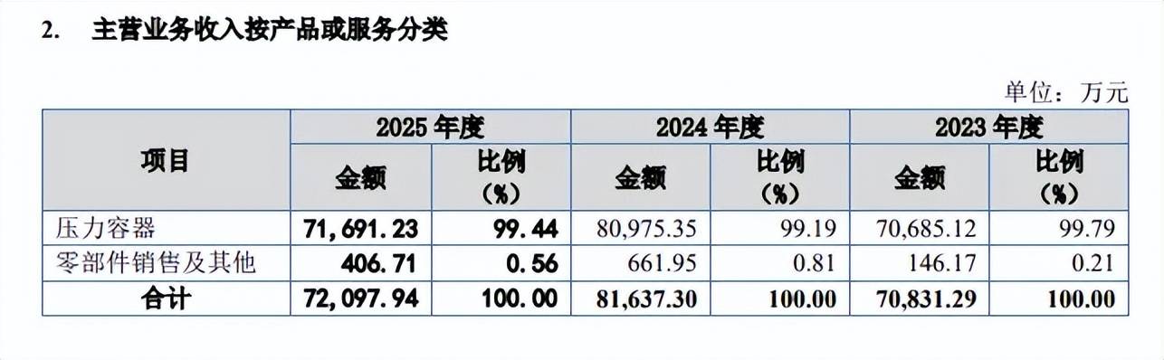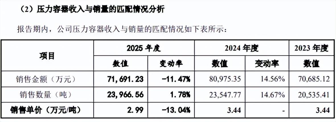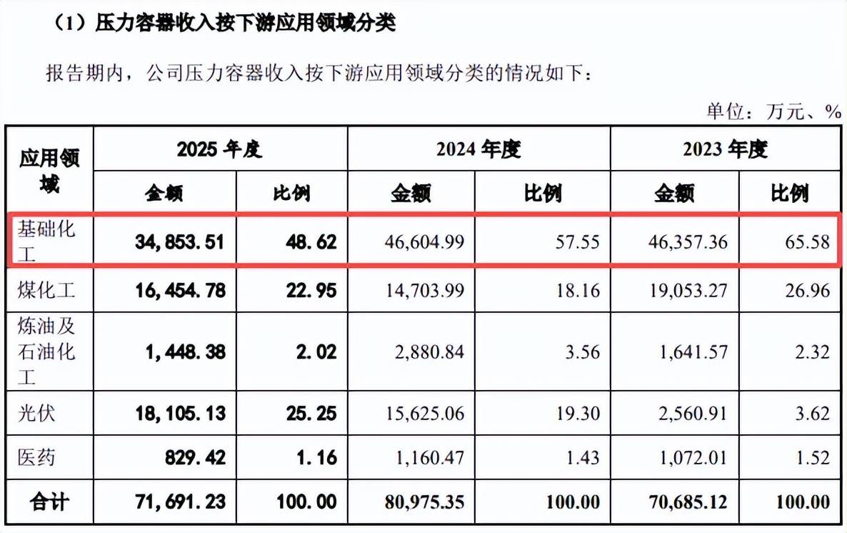 公司压力容器最主要的应用领域包括基础化工以及光伏,招股书显示,2025年,基础化工行业实现营业收入、归母净利润分别为12,701.35亿元、795.73亿元,同比分别减少12205.65亿元、365.27亿元,降幅分别为49.04%、31.46%。