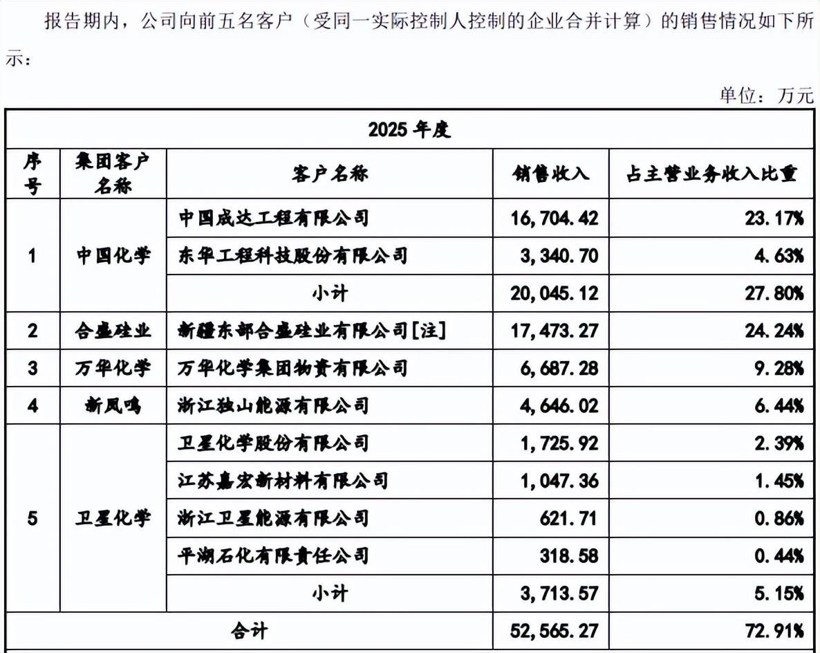 应收账款保持在高位与客户集中度有着重大关联,报告期内对前五客户销售额分别为4.77亿元、5.43亿元、5.26亿元,占主营业务收入的比重分别为67.32%、66.47%、72.91%,客户包括中国化学、合盛硅业、万华化学、新凤鸣、卫星化学、中石化、润阳股份、恒力石化、榆能集团。