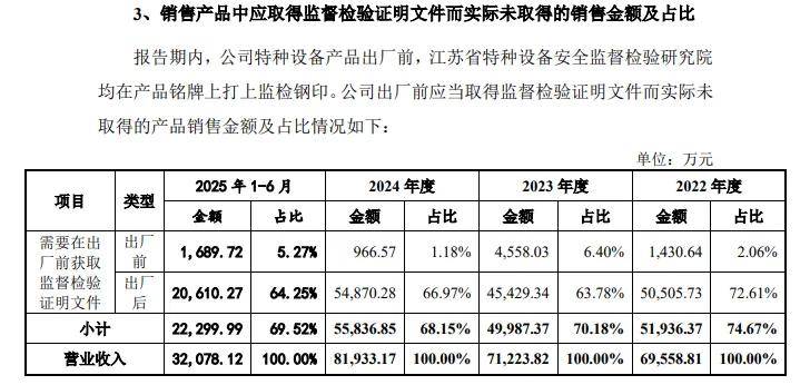 未取得监督检验文件就出售产品。2022年至2025年1-6月(报告期),永大股份出厂前未取得监督检验证明文件的产品的销售金额分别为51,936.37万元、49,987.37万元、55,836.85万元、22,299.99万元,占营业收入比例分别为74.67%、70.18%、68.15%、69.52%。
