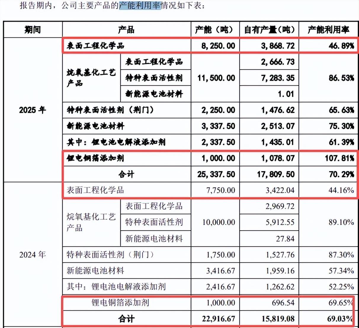 报告期内,公司产能利用率并未饱和,分别为73.51%、69.03%、70.29%,其中表面工程化学品产能利用率分别为47.59%、44.16%、46.89%,而锂电铜箔添加剂波动较大,则分别为85.05%、69.65%、107.81%,两大产品期末产能分别为8,250吨、1,000吨,扩产步伐并不小。