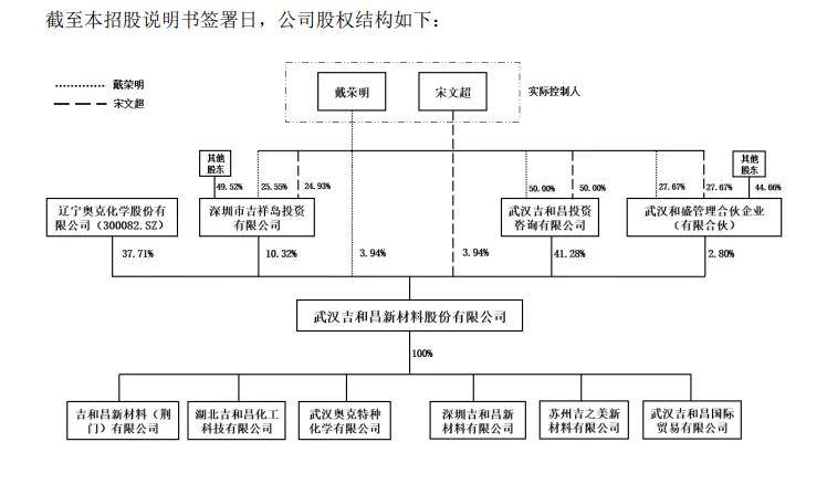 宋文超、戴荣明表决权超62%。吉和昌控股股东是武汉吉和昌投资咨询有限公司,持股比例41.28%,实际控制人是宋文超、戴荣明,直接持股比例均为3.94%,各自持有吉和昌投资50%的股权,各自持有吉祥岛投资24.93%、25.55%的股权,分别持有和盛管理27.67%的财产份额且宋文超为执行事务合伙人,而吉祥岛投资、和盛管理持股比例分别为10.32%、2.8%,即宋文超、戴荣明实际表决权高达62.29%。