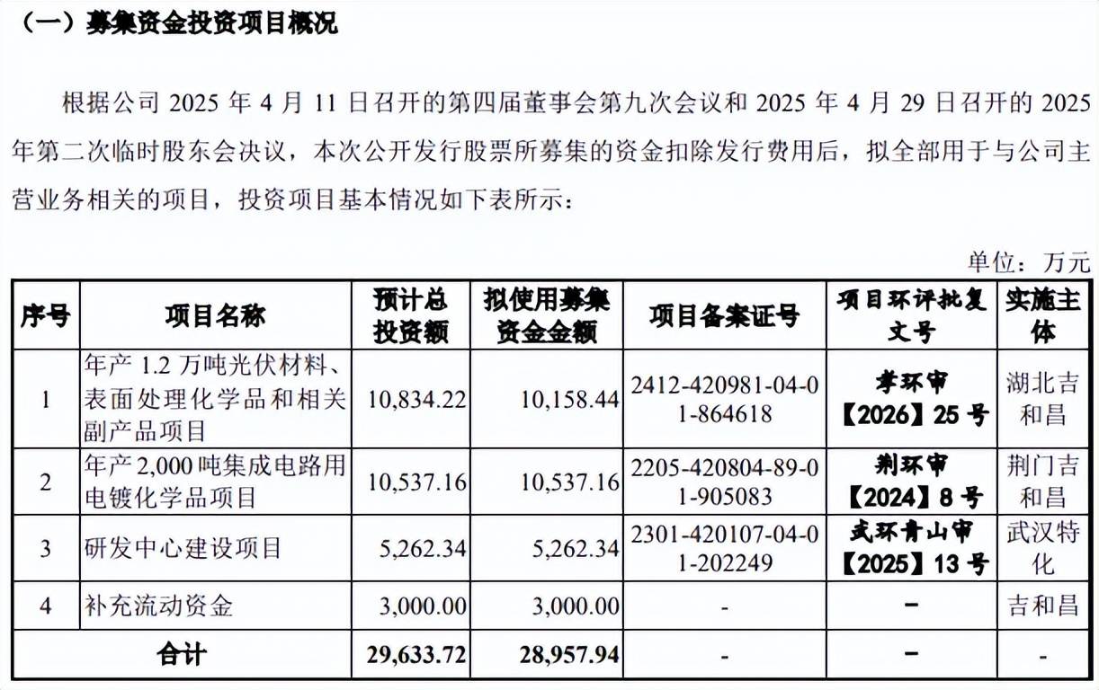据短平快解读了解,本次IPO,吉和昌拟向不特定合格投资者公开发行股票不超过2,800.00万股,拟募集资金28,957.94万元,用于年产1.2万吨光伏材料、表面处理化学品和相关副产品项目(项目一)、年产2,000吨集成电路用电镀化学品项目(项目二)、研发中心建设项目以及补充流动资金,拟使用募集资金分别为10,158.44万元、10,537.16万元、5,262.34万元、3,000万元。