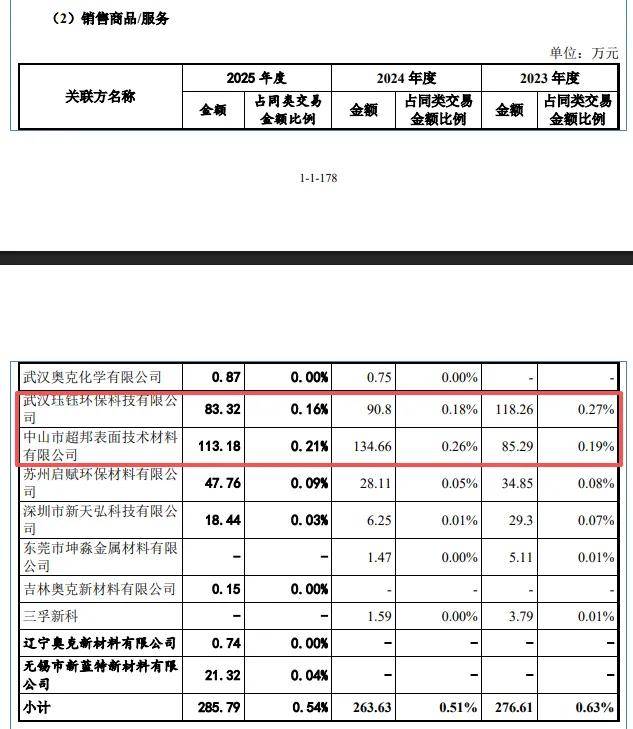另外,公司关联销售金额分别为276.61万元、263.63万元、285.79万元,武汉珏钰环保科技有限公司(珏钰环保)、中山市超邦表面技术材料有限公司(超邦技术)是销售重头,期末销售额分别为83.32万元、113.18万元。