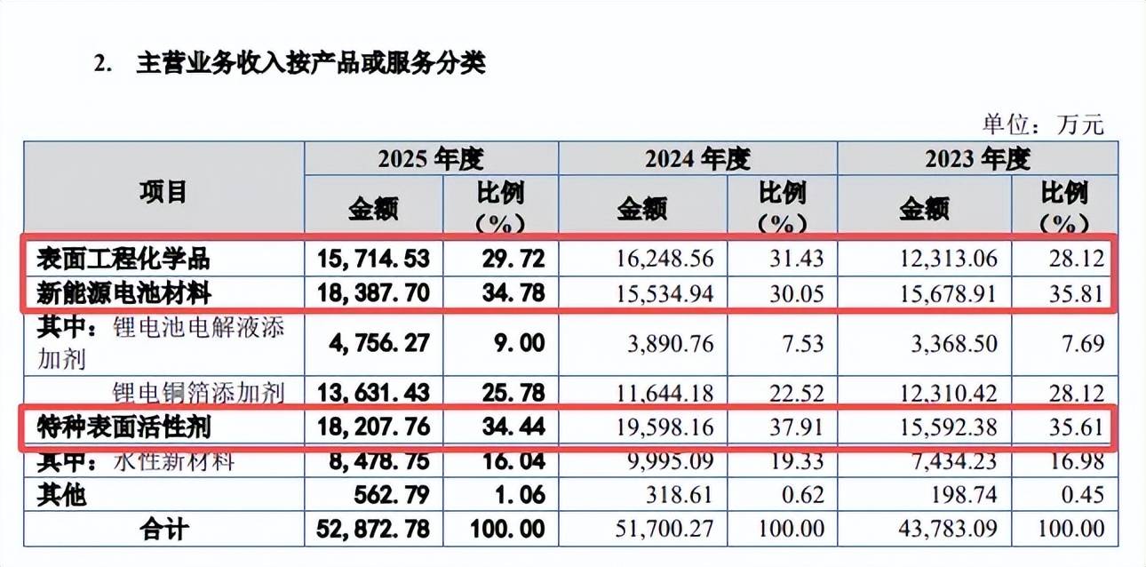 据短平快解读了解,主营业收入主要来源于表面工程化学品、新能源电池材料、特种表面活性剂,期末收入分别为1.57亿元、1.84亿元、1.82亿元,期末占比分别为29.72%、34.73%、34.44%。