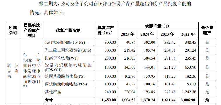 荆门吉和昌年产1.8万吨锂电池电解液添加剂、水性涂料助剂和表面工程化学品项目(一期)中聚二硫二丙烷磺酸钠盐(SPS)产品2025年存在超产,实际产量为771.83吨,而批复年产能为600吨。