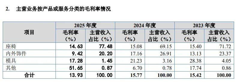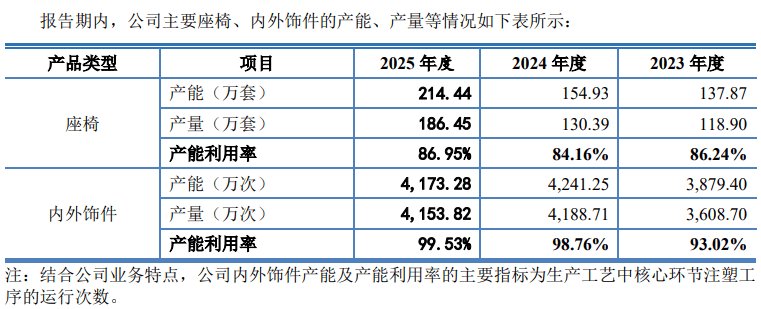 报告期内,公司座椅产能利用率波动较大,总体尚未饱和,分别为86.24%、84.16%、86.95%,2025年产量为214.44万套,总体扩产步伐并不算太大。公司滑轨均为外购,而面套总成的外购比例分别为70.44%、80.25%和73.42%,换而言之本次扩产不单单是对现有产品的扩产,还将部分外购产品转变为自产。