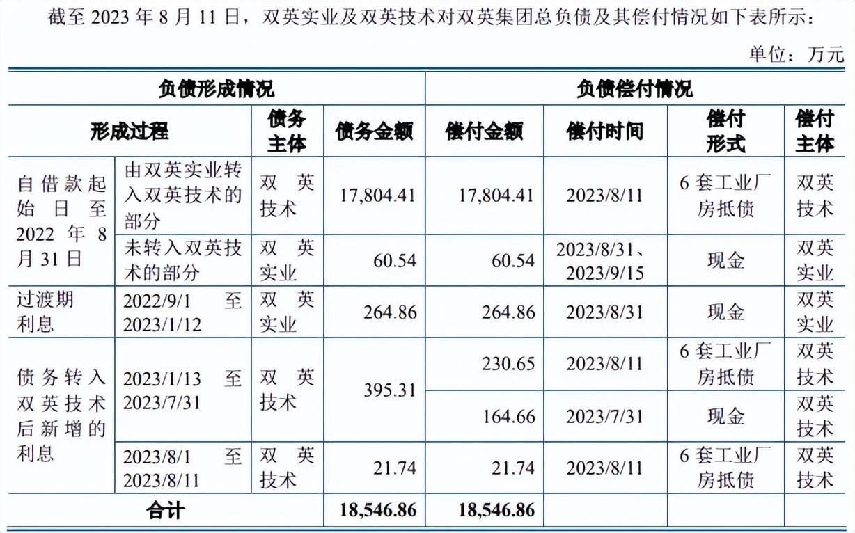 为了解决借款,双英实业以资产+现金的形式清偿其欠付双英集团的借款本金和利息,具体来看,双英实业设立的全资子公司双英技术以6套工业厂房抵债1.78亿元,还以现金164.66万元支付相关利息费用;双英实业以现金60.54万元、264.86万元、21.74万元支付剩余债务以及利息费用,至此资金占用事项最终解决完毕。