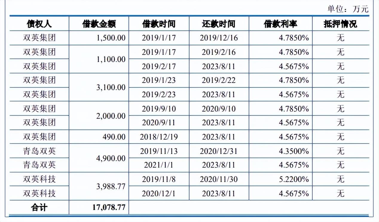 双英实业向公司及子公司借款1.71亿。2018年至2020年期间,杨英、罗德江夫妻合计持股100%的双英实业因偿还银行贷款、支付工程建设款、补充流动资金等需要,陆续向双英集团及其2家全资子公司青岛双英、双英科技累计借款1.71亿元,2019年偿还1500元,待偿还金额1.56亿元。