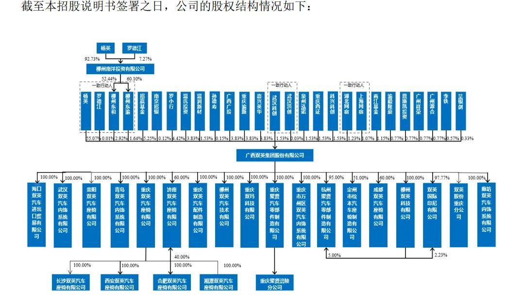 夫妻表决权近60%。双英集团控股股东是杨英,实际控制人为杨英、罗德江夫妻,两人直接持股比例分别为55.0663%、0.0088%,两人通过柳州东和、柳州东渝间接控制4.5589%的表决权,即两人合计控制公司59.6340%的表决权。