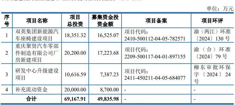 募资缩水1.82亿元,仍要融资4.98亿。本次IPO,双英集团拟发行不超过38,021,560股,拟募集资金49,835.98万元,用于双英集团新能源汽车座椅建设项目、重庆聚贤汽车零部件制造有限公司厂房新建项目、研发中心升级建设项目以及补充流动资金,拟使用募集资金分别为16,525.07万元、17,223.68万元、7,387.23万元以及8,700万元。